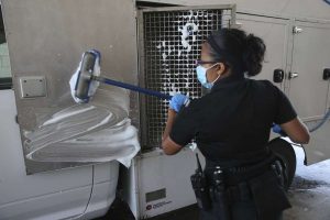 San Antonio Animal Care Officer Adrianna Preciado washes the animal compartments of her vehicle in a plastic container last month. After the compartments dry, she sprays them with sanitizer. Animal Care Services encourages pet owners to have an emergency plan in place for pets if they contract the coronavirus.