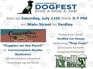 We are fortunate to host an event this Saturday from 5-7pm with 2 local businesses in Yardley, PA to help fundraise for DogFest Philly/NJ 2020. We are so excited to be working with the Commonplace Reader Bookstore and the Yardley Ice House. We will be hosting a “puppies on the porch” event at the bookstore and selling “pup cups” where 100% of the proceeds benefit Canine Companions for Independence DogFest. You’ll also be able to meet Canine Companions service dog teams, and puppies-in-training. DogFest is a family-friendly and dog-friendly community festival that raises funds and awareness for Canine Companions for Independence, the nation’s first and largest service dog providers. This year our event will be virtual on September 26th.