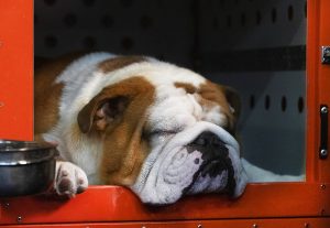 In this Feb. 10, 2020 file photo, a bulldog named Thor naps before competition at the 144th Westminster Kennel Club dog show in New York. America’s dogs are having their day as the coronavirus keeps many people at home more with their pets and is spurring so much adoption and fostering that some shelters’ kennels have emptied. (AP Photo/Mark Lennihan, File)