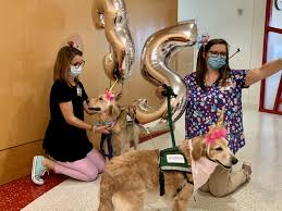 Nugget will be five Aug. 19 and Casey turned three July 15. The two golden retrievers led a celebratory-birthday parade through the hospital’s fifth-floor unit dressed in unicorn horns, birthday bandannas, and silver balloons of the numbers ‘three’ and ‘five.’ Employees guided the dogs from room to room, pulling a wagon of treats and surprises for both the birthday girls and the patients.