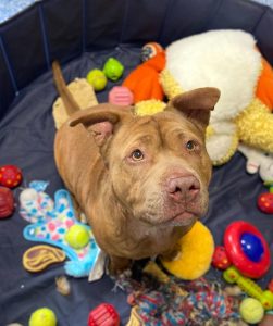 The fourth dog is an older Shar-Pei mix female named Gemma. Gemma is described as “50 pounds, a big ball of wrinkles. Loves stuffed doll animals. She’s a ‘couch potato’ and adores her couch bed surrounded by her stuffed toy animals. She likes to be ‘the queen of attention.’” The only negative about Gemma, she suffers from separation anxiety, so she needs to be with someone all the times and doesn’t like other dogs. She will need to go to a home where she is the only animal.