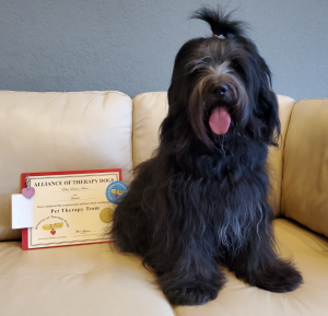 Drewes-Stoen is a professional dog trainer, and has shown dogs for over 30 years. Quasar is her most recent furry companion. He is a a Schapendoes (Dutch Sheepdog), and was certified with the Alliance for Therapy Dogs (ATD).