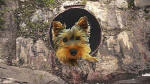 It then occurred to Wynne that the solution might be to send Smoky through the pipe. This would not be easy since not only was the culvert narrow, but its diameter was further restricted by the fact that sifted sand had moved into it and drifted into piles that cut the space by half in some places. Nonetheless, they decided to tie a string to Smoky’s collar and Wynne worked his way across the field to the other end of the pipe.
