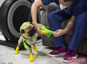 Psychologist and neuropsychologist Lucia Ledesma Torres puts protective equipment on to her dog Harley to prevent the spread of the new coronavirus, COVID-19, in Mexico City, on May 13, 2020. Harley, a three-year-old Pug puppy, is part of the psychiatry and psychology service of a public hospital assigned by the government to care for patients with the coronavirus. As a co-therapist, Harley gives support and emotional assistance to doctors and nurses who have already spent at least 50 days in the first line treating patients with COVID-19.