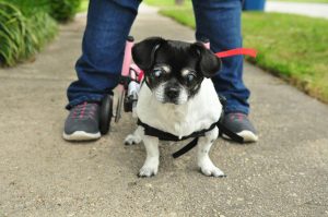 Bella, a dog Ms. Carpenter adopted in 2018 from the local animal rescue group Misplaced Mutts, was paralyzed in the rear legs during a previous accident. She has been equipped with a special stroller that allows her to remain mobile.