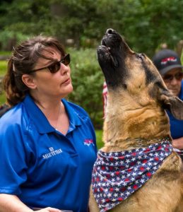 Until late June 2020, K9 Kaiser—an exceptionally large German shepherd, weighing 160 pounds—was one of 22 dogs on the MWDM K9 Salute Team. In ceremonies honoring dogs at the MWDM, Kaiser performed a howling salute, much like a 21-gun salute, that would resound and recognize the honoree being interred during a service.