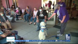 At this time volunteers and their dogs have not been able to resume their normal visits at hospitals and schools, but we were able to visit with them at an adult daycare center in Henderson with COVID-19 protocols in place.
