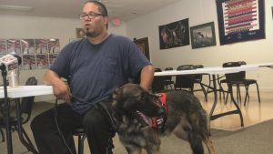“He helps out so much, and if it wasn’t for the community caring, and loving, and whatnot, I don’t think I would’ve had him,” Alverio said. “He’s a service animal when he has his vest on. He’s working when he has his vest on, and he knows that. When he doesn’t have his vest on and we’re at home, he’s a family member, and he knows the difference.” Merimee said Lincoln is the sixth service dog given to a local veteran.