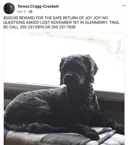 A Trail family is urging locals to keep their eyes peeled for Joy Joy, their beloved black cockapoo that went missing Nov. 1.