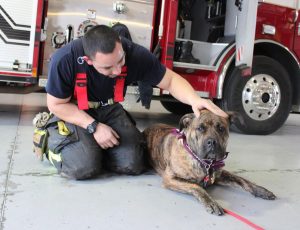 Moses, a year-and-a-half-old Canary Mastiff, was a bit unsure of his surroundings during a recent visit to the county fire station on Public Safety Drive, but he enjoyed the head scratches and bully rubs even if he wasn’t fond of the smell of smoke from a lingering training exercise or the look of firefighters laden with gear.