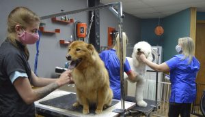 Carpin’s two full-time employees, Taylor Ehrensberger and Alexis Lowe, are training to be groomers — one currently bathes and blow dries the dogs, and one blow dries and brushes, she said.