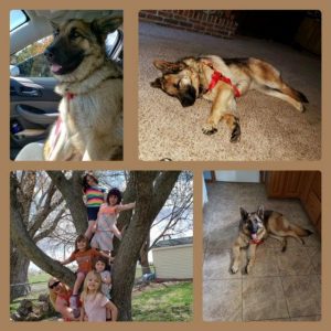 Sarah shared some things with me through email and text messaging since that day they picked her up. It was a slow start as Layla was very unsure why her life had changed so much. Sarah said, “Layla now does great in public and doesn’t scare near as easy. She was unsure about the doggie door we had, and must have not thought it was not sturdy enough in nature. The reason I know this is when I peered out the kitchen window, I found the plastic in at least six pieces in the back yard. Apparently, she approves of the new custom-made frame doggie door held together by carriage bolts, because it is still there. She has also found a love, Scary Terry who is a black and white cat and another furry friend Hanako, an Australian Shepherd. She also has a herd of little girls she enjoys very much. She is becoming a service dog as well and it has been hard work!”