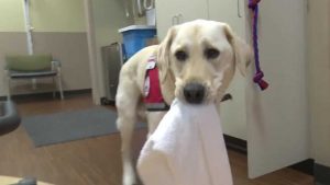 “He is so chill, which is actually an ideal thing for this rehab setting,” Gerrish said. “He knows when he needs to tuck under a desk to get out of the way. He really is perfect for this environment.”