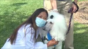 At UC Irvine Medical Center in Southern California, therapy dogs Dexter and Monet have an important mission, to bring smiles and comfort to healthcare workers. The dogs are part of the hospital’s volunteer pet therapy program, visiting employees once a month.