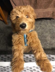 Goldendoodle– a cross between a Golden Retriever and a Standard Poodle. Because of their temperament, Goldendoodles are often chosen for use as therapy dogs. They are widely known as companion dogs with temperaments that are described as friendly and outgoing, strongly human-oriented with a love for pleasing their human friends. Their kind, friendly eyes express character, intelligence, and are very inviting which helps to relieve fear of dogs that some students might experience.