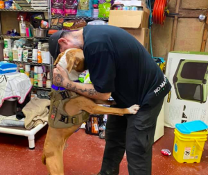 After the vet check, Kilo visited Johnson’s garage, where she gave him treats and toys from her homeless outreach program.