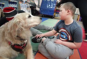 While students are reading, Zephyr may wander the room, checking in on each child until he finds who needs him the most, said Tanner. Then he will sit down and let the student pet him or read to him. Some students with high anxiety are allowed special time with him, or students may earn time to visit Zephyr to reinforce positive behavior.