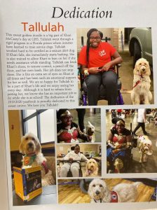 Within two weeks of my visit, the school was shut down due to the pandemic. Months later, Khari and her family were surprised to learn the Gardendale High School yearbook had been dedicated to Tallulah. She touched the hearts of everyone at school, but she is a game changer for Khari. Khari’s condition had improved greatly over the past year as Tallulah sensed her seizures coming on and could calm her, sometimes even stop seizures from happening. If the two were ever separated, Khari would become anxious and miss having her best friend by her side.