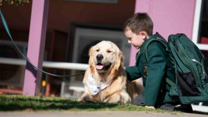 Most will have to leave parents and pets at home, however a lucky group of primary school children at Gippsland Grammar will be welcomed on campus by the wagging tail of Wilson, the school’s resident comfort dog.