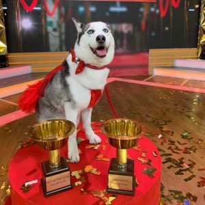 Glittering gold confetti fell from the ceiling as Izzy the husky wobbled up to a red podium to claim the nationwide title of “Pet of the Year.”