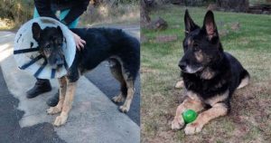 On December 18, 2019, Davina Liberty, a Mendocino County coast resident, was in the woods near Caspar riding her horse when she saw a German Shepherd wearing a plastic cone and clearly injured and suffering from dehydration and starvation. She and her husband loaded Thunder into the back of a pickup truck and Thunder’s road to recovery began.