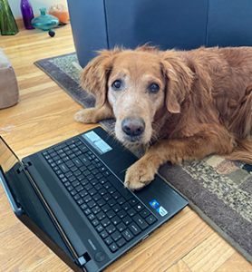 First, there is a web page that has close-up photos of her eyes coupled with calming music. Hundreds of individuals who have visited the page have reported they felt a calm, connected state of being. Eye contact is one of the anxiety-reducing techniques that Ricochet uses in her face-to-face therapy dog sessions. Gazing into a dog’s eyes stimulates the release of oxytocin—a hormone associated with positive, happy feelings. Cultivating these moments allows for deep experiences of connection regardless of whether physical contact is made. Another facet of the program is video conferencing which uses apps such as Zoom, FaceTime and Skype.