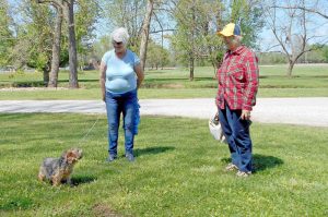 Thursday’s warm weather encouraged folks to emerge from isolation to enjoy walking their cooped up canine companions at Pierce City’s South Park. From left, Al, the service dog owned by Cathy Lewis, center, took his ladies out for a comfortable two-mile stroll in the afternoon. The two were joined by Julie Bishoff, right, a friend of Al and Cathy. Melonie Roberts/reporter@monett-times.com